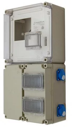 Egyfázisú fogyasztásmérőhöz, 2 db alsó elhelyezésű, 150x300x170 mm-es kábelfogadó és elmenő szekrények földkábeles csatlakoztatáshoz. Az elmenő oldalon 2 db 138 mm hosszú, magasított, TS35 kalapsínnel, és 2 db 6 modulos, csapófedeles ablakkal szerelve, maximum 12 db kismegszakító kezeléséhez. A szekrényen 2 db 3P 16A/230V dugalj, 2 db 16A/1C kismegszakító és 1 db 2P 40A 30mA Fi-relé található, kompletten vezetékezve. A kábelfogadó oldalon 1 db 138 mm hosszú, TS35 kalapsínnel, melyen 4 pólusú, 25/16mm2 vezeték fogadására alkalmas főáramköri leágazó kapocs található. 2 db PG 36, 1 db PG 9 tömszelence.